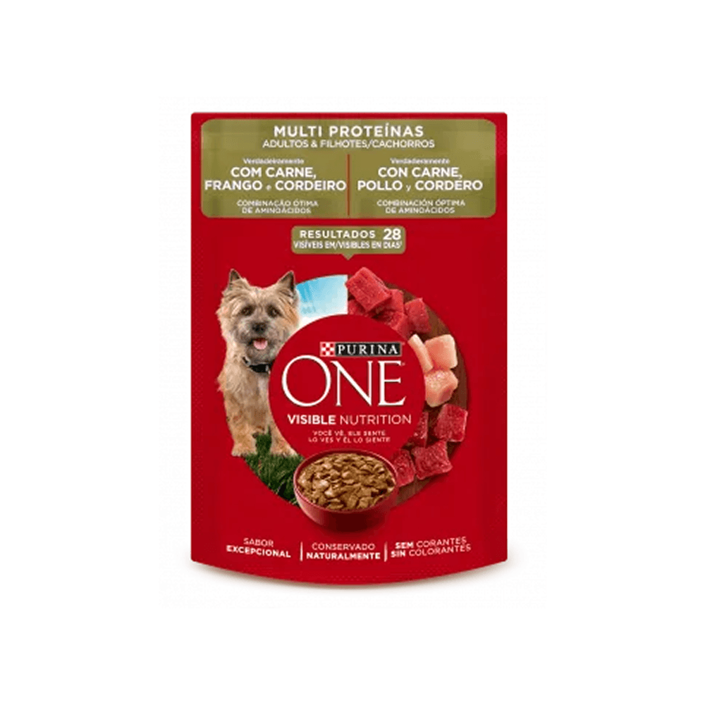 Sachê One Cães Multi Proteínas Carne, Frango E Cordeiro 85g Sachê One Cães Multi-proteínas Cordeiro É Um Alimento Úmido Balanceado Completo Para Cães Adultos E Cachorros De Todos Os Tamanhos. Especificações: • Sabor Excepcional• Preservado Naturalmente• Sem Corantes• Combinação Ideal De Aminoácidos Ingredientes: Água Suficiente Para O Processo, Carne De Frango, Glúten De Trigo E / Ou Farinha De Soja, Fígado De Frango E / Ou Coração E / Ou Fígado E / Ou Vísceras De Porco, Carne De Cordeiro, Carne Bovina, Amido De Milho, Glicina, Dextrose, Fosfato De Cálcio E / Ou Carbonato, Sal **, Pirofosfato Tetrassódico E / Ou Difosfato Trissódico, Vitaminas (a, D3, E, K3, Mononitrato De Tiamina (b1), Riboflavina (b2), Niacina (b3), Pantotenato De Cálcio (b5), Cloridrato De Piridoxina (b6), Biotina (b7), Ácido Fólico (b9), Cianocobalamina (b12), Cloreto Colina), Cloreto De Potássio, Taurina, Minerais . ** Cloreto De Sódio (sal) (min / Max) 0,1% / 0,6%. Níveis De Garantia: Proteína Bruta (min.) 11,0%, Resumo Gordura Etérea / Bruta (min.) 2,8%, Fibra Bruta (máx.) 1,3%, Umidade (máx) 81,0%, Cinzas / Minerais (máx.) 2,8%, Cálcio (min / Max) 0,15% / 0,50%, Fósforo (min / Max) 0,10% / 0,40%. Quantidade Recomendada: Idade Do Cão Unidade Para Cada Kg De Peso Corporal Filhotes 1 Cada 0,7 Kg Adultos Até 10 Kg 1 Por 1 Kg Adultos Com Mais De 10 Kg 1 Para Cada 2 Kg • Quando Servido Com Comida Seca, Cada Unidade One® Corresponde A 22 G (1/4 Xícara De 200 Ml) De Dry One®. Ajuste A Alimentação Para Manter A Condição Corporal Ideal Do Seu Cão. A Mudança Na Dieta Deve Ser Feita Gradativamente Por Um Período De 7 A 10 Dias.