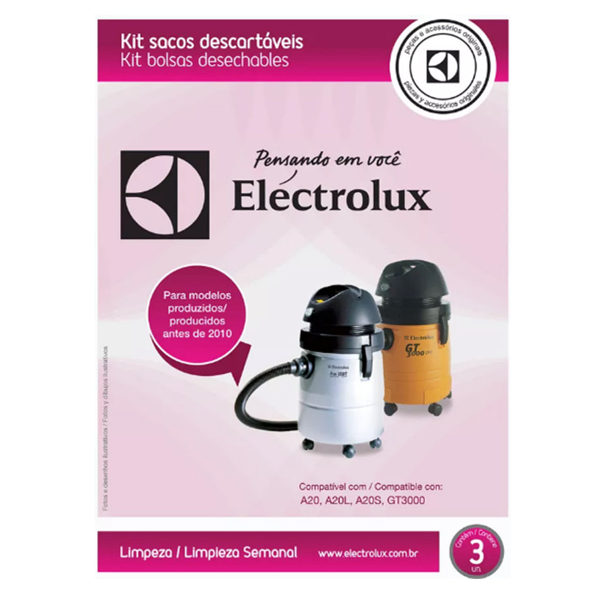 Saco descartável original para aspirador Electrolux Contém 3 unidades Compatível com os modelos A20, A20L, A20S, GT3000 Recomenda-se a troca a cada 2 meses Composição:Celulose Fabricado pela Electrolux no Brasil SOMENTE PARA MODELOS PRODUZIDOS ANTES DE 2010