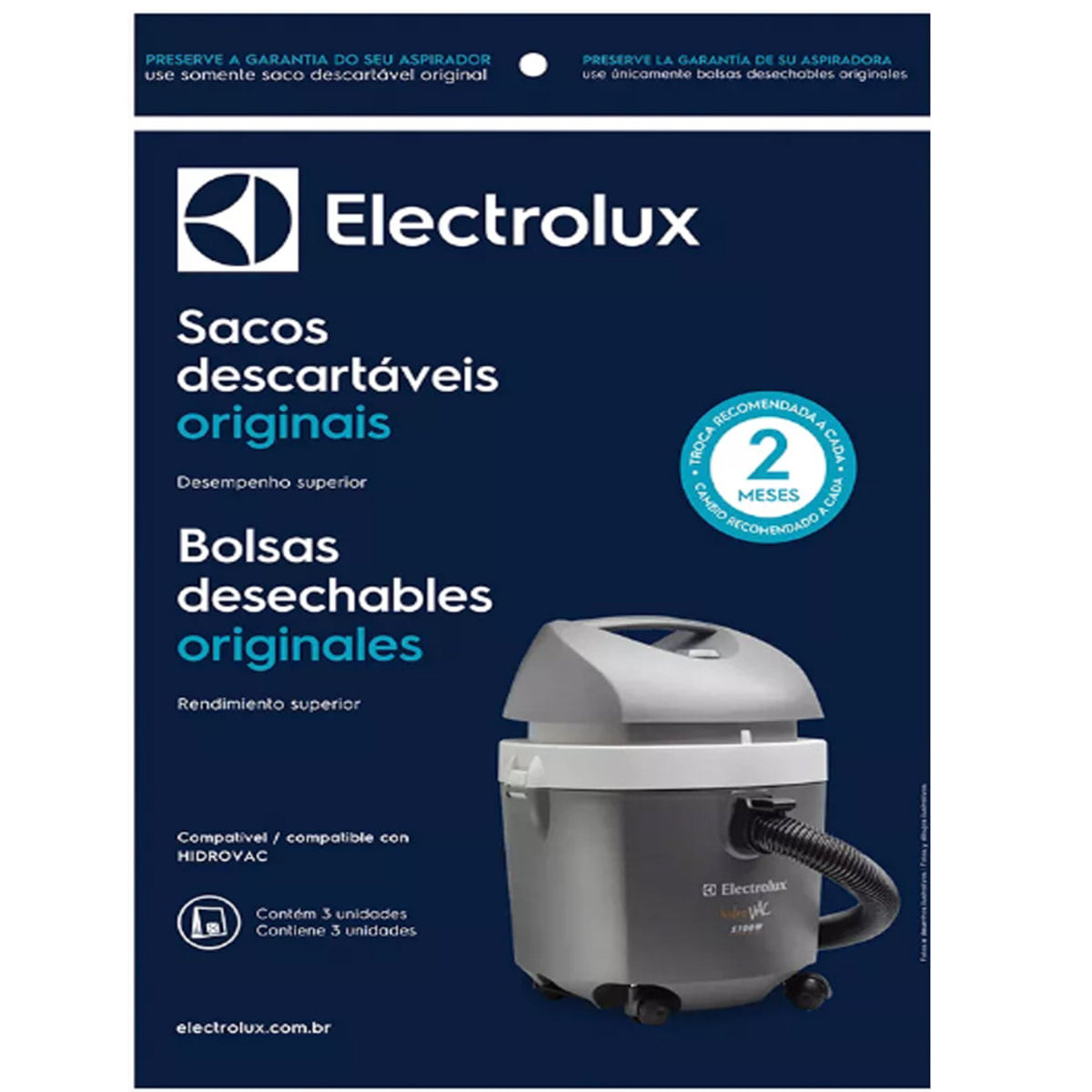 Saco descartável original para aspirador Electrolux Contém 3 unidades Compatível com o modelo Hidrovac Recomenda-se a troca a cada 2 meses Composição:Celulose Fabricado pela Electrolux no Brasil