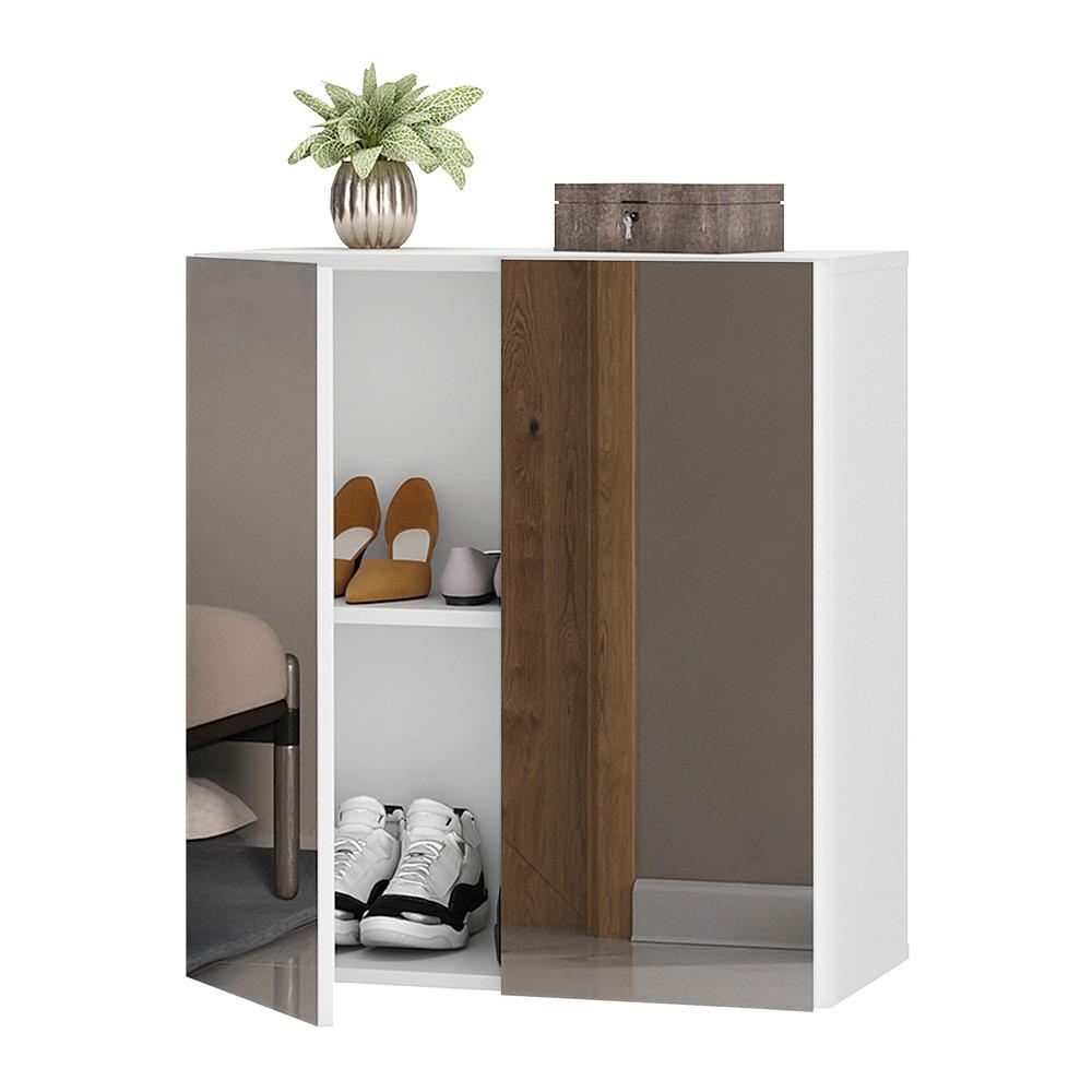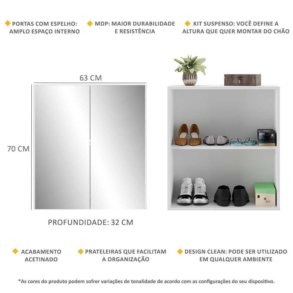 A Sapateira 2 Portas Suspensa Com Espelho Nina Multimóveis É Produzida Em Mdp Com Acabamento Acetinado (cerca De 20% De Brilho), Que Garante Maior Durabilidade, Facilidade Na Limpeza, Além De Um Acabamento Superior. Com 2 Portas, Possui Um Excelente Espaço Interno Para Acomodar Seus Sapatos E Demais Pertences (a Prateleira Interna Suporta 8 Kg E O Tampo 9 Kg) E Ainda Acompanha Kit Para Ser Montada De Forma Suspensa, Conforme A Altura Que Você Quiser Do Chão. Os Espelhos Nas Portas Deixam O Móvel Mais Requintado, Criando Um Ambiente Moderno E Charmoso. Os Espelhos São De Vidro (o Que Evita Que A Imagem Fique Distorcida) E Lapidados, Ou Seja, Passam Por Um Processo Para Que As Bordas Não Fiquem Cortantes, O Que Garante Maior Segurança. Compacta, É Uma Excelente Opção Para Otimizar Seu Ambiente, Para Que Você Possa Aproveitá-lo Da Melhor Maneira Possível.conteúdo Da Embalagem:1 (uma) Sapateira1 (um) Kit Com Suporte Para Sapateira1 (um) Kit Com 2 Espelhosdimensões Do Produto Montado:altura: 70cm | Largura: 63cm | Profundidade: 32cm*você Pode Consultar As Medidas Internas Na Imagem Técnica Do Produto.cores Disponíveis:branco - Preto*as Cores Do Produto Podem Sofrer Variações De Tonalidade De Acordo Com As Configurações Do Seu Dispositivo.imagem Meramente Ilustrativa. Decoração Não Acompanha O Produto.produto Novo - Acompanha Nota Fiscal, Manual De Montagem E Certificado De Garantia.o Produto Será Entregue Desmontado E A Multimóveis Não Disponibiliza O Serviço De Montagem.