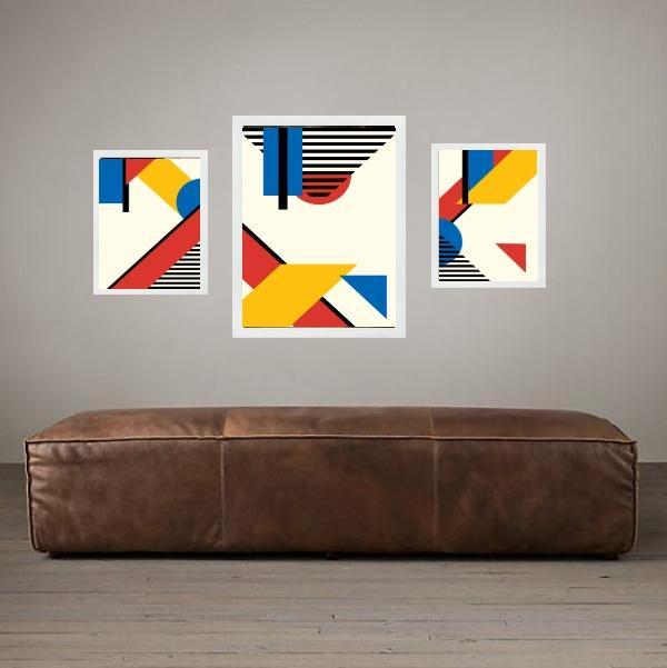 Set 3 Quadros Abstratos Mondrian - Com Vidro
