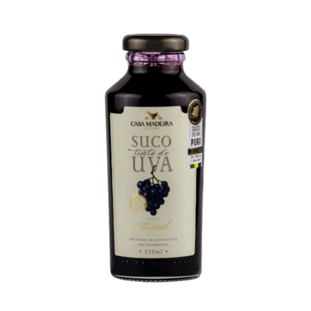 O Suco de Uva Casa Madeira é um produto natural, saudável, elaborado com a pureza e qualidade da uva do Vale dos Vinhedos. Integral e sem adição de açúcar, fonte de nutrientes e energético, é um 'blend' elaborado com as cepas Isabel e Bordô, não possuindo conservantes ou qualquer aditivo químico em sua composição. Engarrafado a uma temperatura média de 80ºC e imediatamente pasteurizado, o suco mantém a durabilidade, aromas intensos e boa persistência gustativa. Seu método de elaboração, a partir do aumento de temperatura, extrai 1 litro de suco a cada 1,7 quilos de uva, preservando todas as enzimas que combatem os radicais livres e ajudando a reduzir o colesterol ruim que prejudica o sistema cardiovascular. Ideal para refeições leves, para crianças e para pessoas com restrição ao álcool ou que desejam ter o controle do seu colesterol. NÃO CONTÉM GLÚTEN. SEM CONSERVANTES. SEM ADIÇÃO DE AÇÚCAR. SEM ADIÇÃO DE ÁGUA.