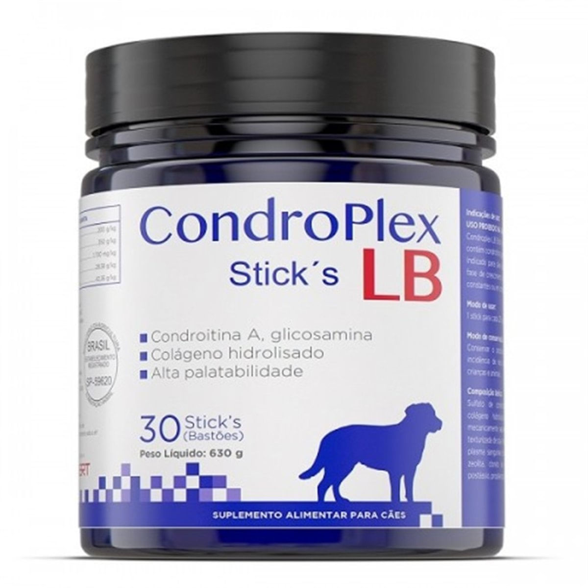 DescriçãoSuplemento Condroplex LB Stick's 630g30 BastõesDescriçãoSuplemento alimentar composto por nutrientes essenciais às articulações, indicado para cães de portes grande e gigante em qualquer idade. Stick's de alta palatabilidade, formulado com condroitina, glicosamina e colágeno hidrolisado.Pode ser utilizado em animais sadios que praticam atividades físicas constantemente, neste caso a suplementação vai atuar na prevenção da degeneração articular decorrente dos constantes impactos nas articulações provocadas pela intensidade do exercício, em animais maduros ou sênior atuará com ação preventiva, diminuindo os riscos de ocorrências de lesões articulares ocasionadas pelo enfraquecimento das articulações, filhotes em fase de crescimento contará com os compostos necessários ao fortalecimento articular, prevenindo futuras disfunções e até mesmo animais obesos, terão grandes benefícios pois estes animais tem excesso de peso suportado pelas articulações, o que pode pode acelerar processos de degeneração, tendo a mesma ação em animais que já sofrem de alguma debilitação.Indicado Cães Porte Grande e giganteIdade Filhotes, adultos e idososMarca Avert
