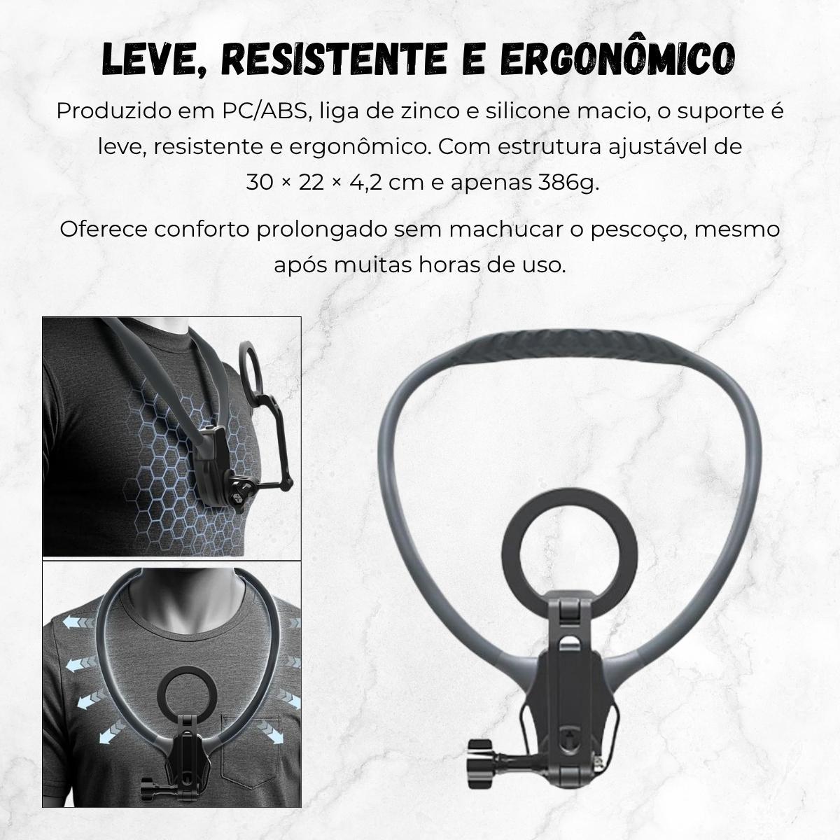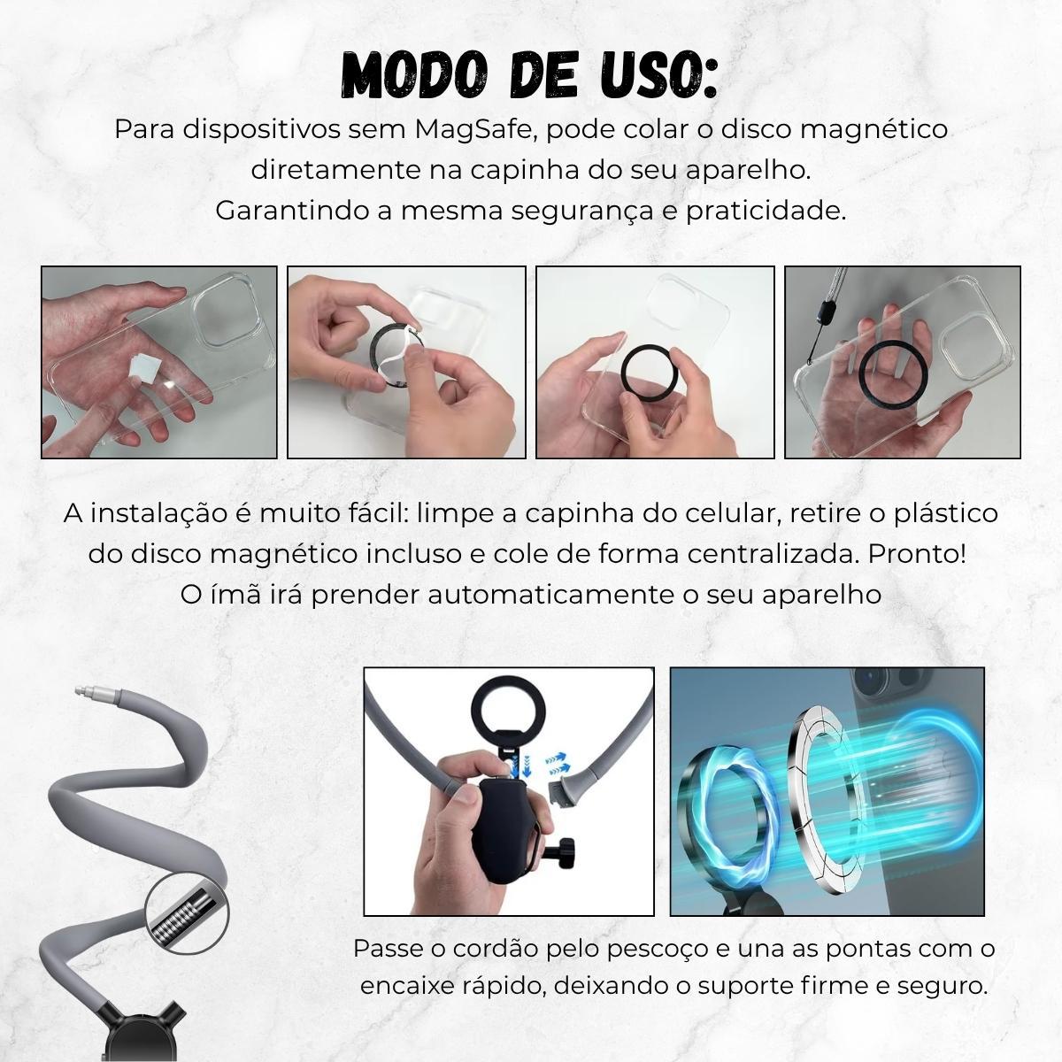 Produzido Em Pc/abs, Liga De Zinco E Silicone Macio, O Suporte É Leve, Resistente E Ergonômico, Projetado Para Longas Horas De Uso Sem Machucar O Pescoço. Sua Tecnologia Magnética Magsafe Mantém O Smartphone Firme E Seguro, E A Base Com Rosca Universal (1/4) Permite Conectar Câmeras Compactas Ou Acessórios.