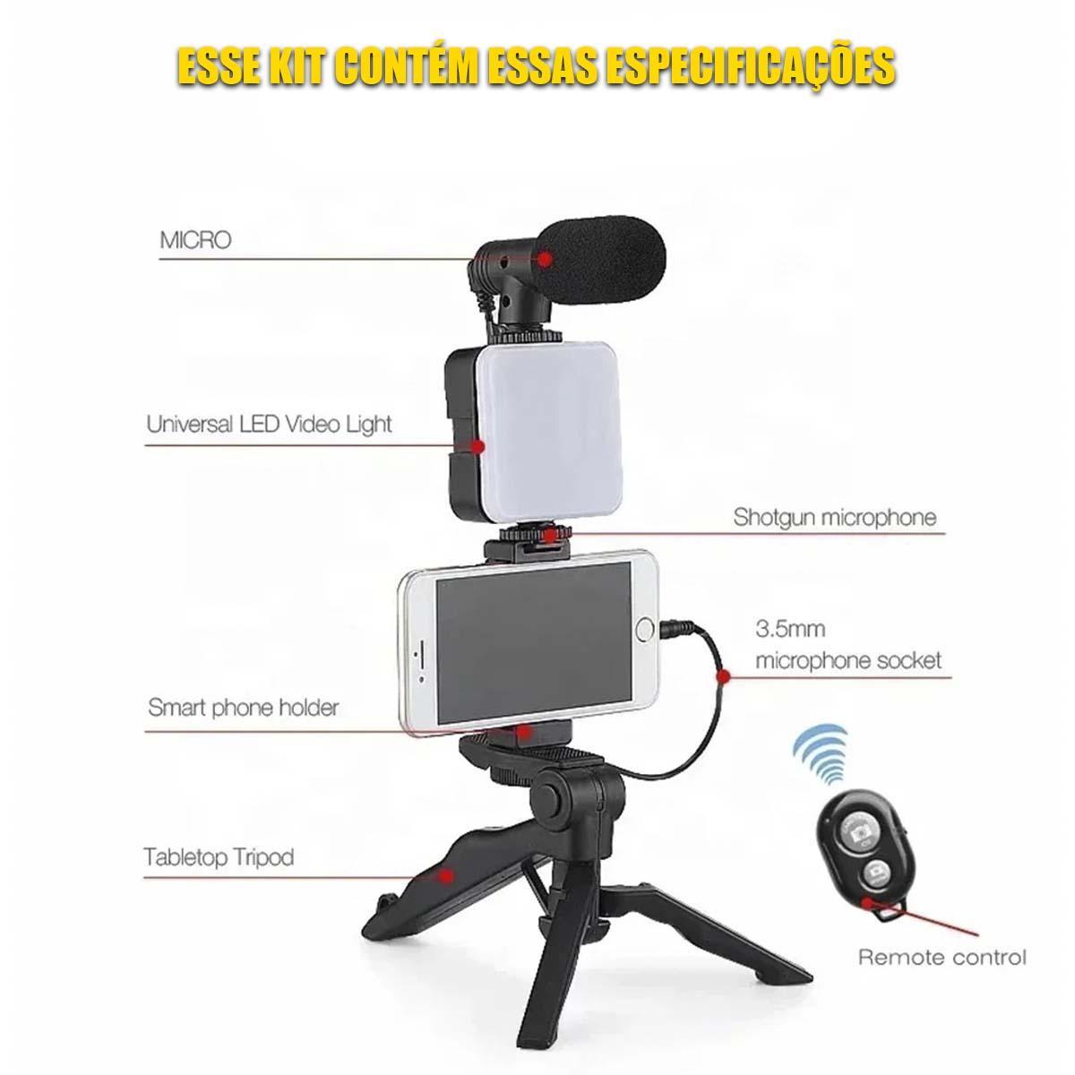 Kit inicial com mini microfone para transmissão ao vivo, chamadas de vídeo, vlogging. Ay-49 Video Vlogger Kits. Microfone, LED, luz de preenchimento, mini tripé para telefone, vlog, gravação de vídeo condensador.