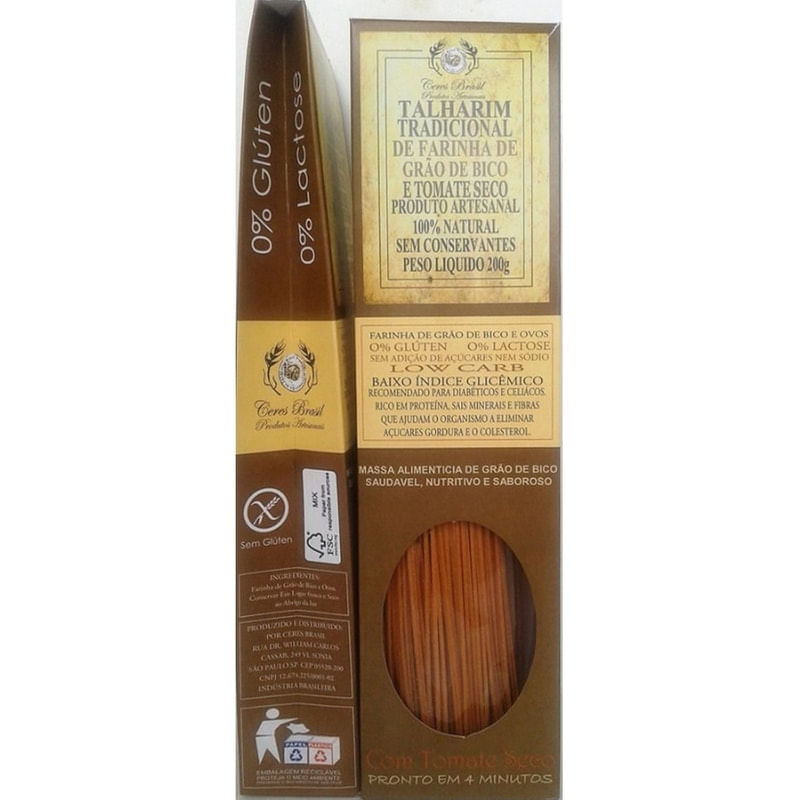 Macarrão de Grão de Bico e Tomate Seco. .Ceres Brasil 200g.Talharim de Farinha de Grão de Bico e Tomate Seco.Produto artesanal 100% natural sem conservantes..Ingredientes: Farinha de grão de bico e ovos..Não contém Glúten..Não contém Lactose..200 g.Validade de 10 Meses.. . . .Talharim de Farinha de Grão de Bico. .Massa sem glúten.. .O macarrão de farinha de grão de bico é 100% natural 0% glúten 0% Lactose, totalmente indicado para celíacos e diabéticos, sem conservantes.. .Esse delicioso macarrão com baixo indece glicêmico low carb vem em 4 sabores.Tradicional.Tomate Seco.Funghi Seco.Espinafre Seco. .Adeus sensação horrível que sentimos depois de apreciar aquela pratada de massa comum, Isso nunca mais. O talharim de farinha de grão de bico, é famoso pela sensação de alivio de saciedade que ele proporciona após uma pequena quantidade. . . .Não Contém Glúten 100% natural.. . Pronto em 2 minutinhos.. . Grão de Bico é uma boa fonte de zinco, folato e proteínas. Ele também contém muita fibra alimentar, tendo como benefícios não contém Glúten, Baixo índice Glicêmico, Alto teor de Fibras,rico em proteínas, ferro, ácido, fólico e vitaminas B1, B5, B6 e E Ômega 3 e 6, magnésio, cálcio, zinco.. ..Não Contém Glúten 100% natural..Estudos recentes indicam que grão de bico poderia ter benefícios na redução do colesterol na corrente sanguínea.