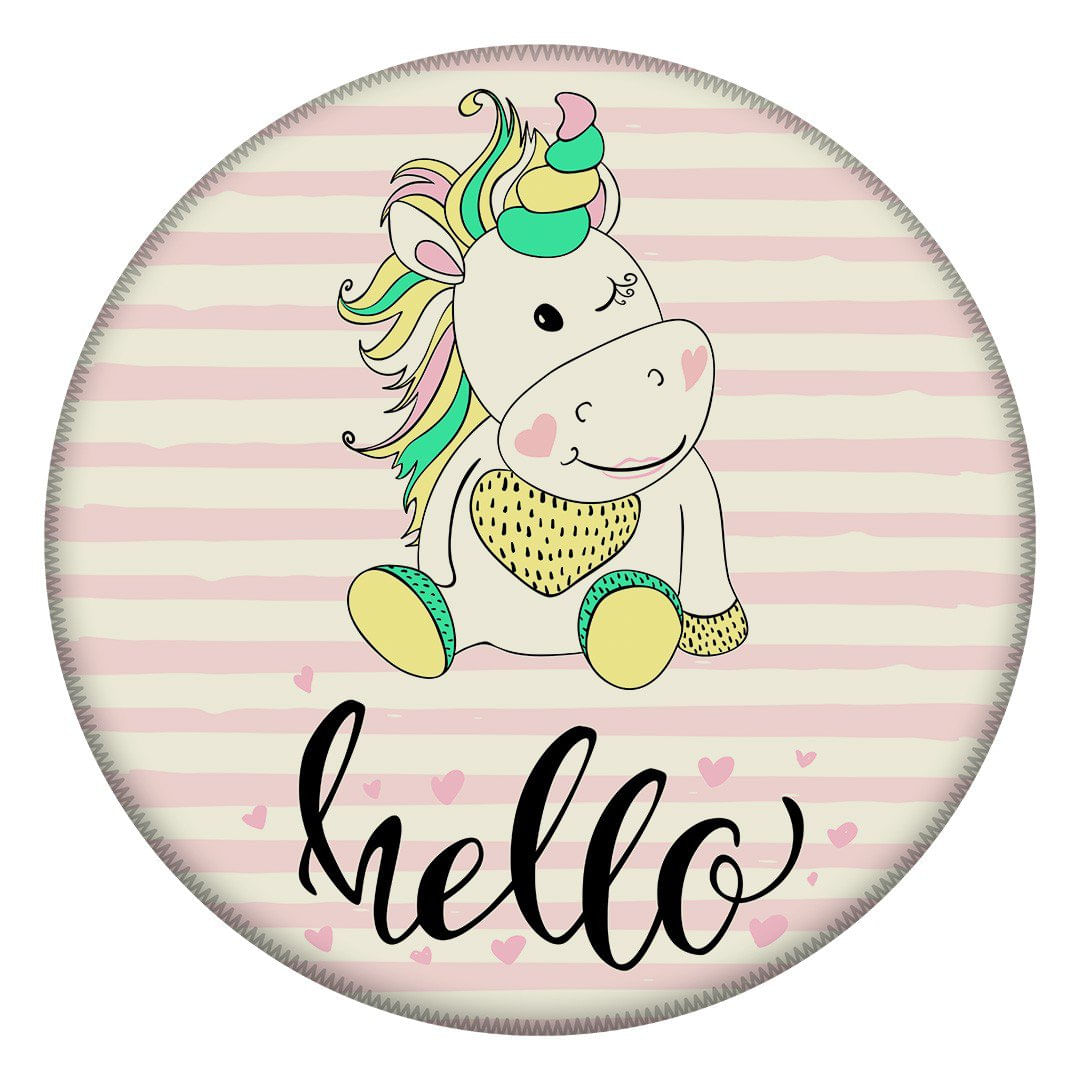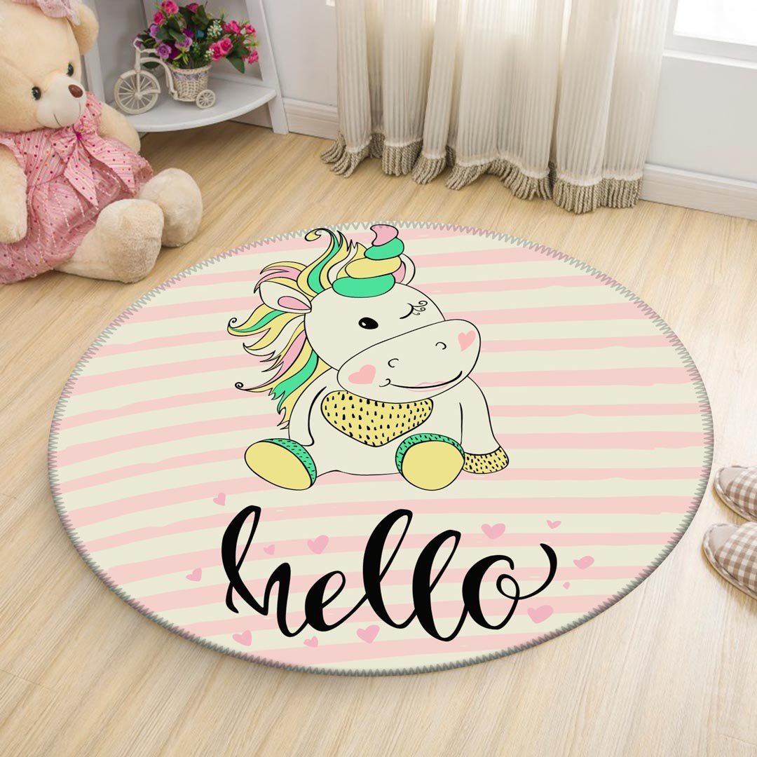 Tapete Redondo Wevans Unicorn Hello 84cm - ...Características Gerais do Produto:.. Tema: Infantil. Tecido: 100% Poliester. Base: Emborrachada Antiderrapante. Tamanhos Disponíveis: 84 cm de Diâmetro (Redondo), 94 cm de Diâmetro (Redondo). Estampa: Digital de Alta Qualidade, Aplicado por Termotransferência. Gênero: unissex. Faixa etária: Acima de 13 anos...Garantia:.. Garantia contra defeito de fabricação