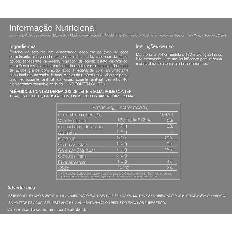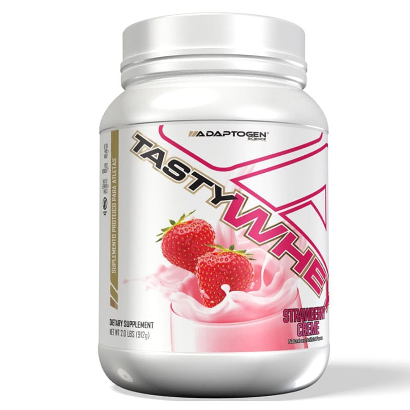 Tasty Whey Adaptogen Sabor Morango 912 G..Tasty Whey é uma proteína realmente deliciosa..Com alto valor biológico de excelente absorção, que auxilia no crescimento muscular. .É uma ótima opção para quem gosta de criar receitas saudáveis. .DIFERENCIAIS - Auxilia no ganho de massa muscular...Disponível nos formatos 900 g e 1800 g...Registro ISENTO conforme resolução RDC ANVISA 23/00 E 27/10 anexo I.