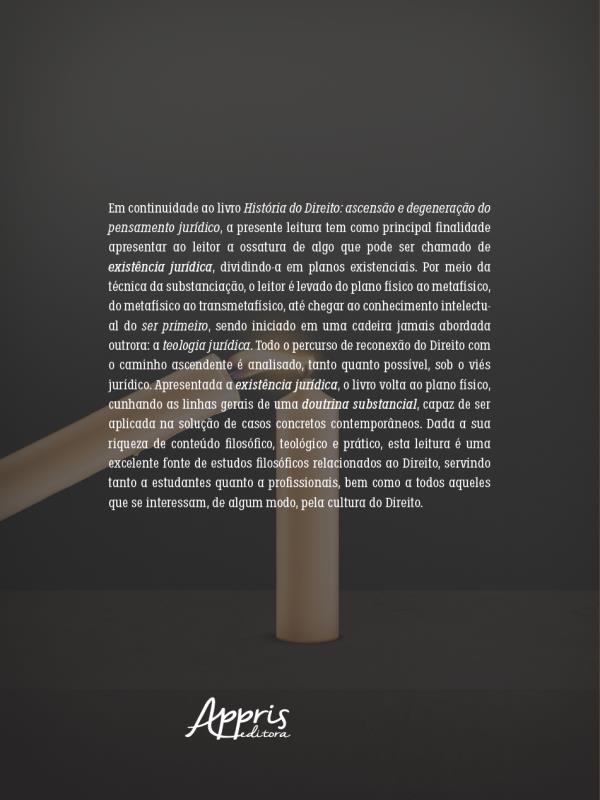 Em Continuidade Ao Livro História Do Direito: Ascensão E Degeneração Do Pensamento Jurídico, A Presente Leitura Tem Como Principal Finalidade Apresentar Ao Leitor A Ossatura De Algo Que Pode Ser Chamado De Existência Jurídica, Dividindo-a Em Planos Existenciais. Por Meio Da Técnica Da Substanciação, O Leitor É Levado Do Plano Físico Ao Metaf Ísico, Do Metaf Ísico Ao Transmetaf Ísico, Até Chegar Ao Conhecimento Intelectual Do Ser Primeiro, Sendo Iniciado Em Uma Cadeira Jamais Abordada Outrora: A Teologia Jurídica. Todo O Percurso De Reconexão Do Direito Com O Caminho Ascendente É Analisado, Tanto Quanto Possível, Sob O Viés Jurídico. Apresentada A Existência Jurídica, O Livro Volta Ao Plano F Ísico, Cunhando As Linhas Gerais De Uma Doutrina Substancial, Capaz De Ser Aplicada Na Solução De Casos Concretos Contemporâneos. Dada A Sua Riqueza De Conteúdo Filosófico, Teológico E Prático, Esta Leitura É Uma Excelente Fonte De Estudos Filosóficos Relacionados Ao Direito, Servindo Tanto A Estudantes Quanto A Profissionais, Bem Como A Todos Aqueles Que Se Interessam, De Algum Modo, Pela Cultura Do Direito.