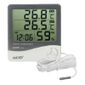 Termo-higrômetro digital com sensor externo e relógio.especificação técnica.faixa de medição:.-10 a 50°c (sensor interno).-50 a 70°c (sensor externo).20 a 99%ur..resolução:.0.1°c.1%ur..exatidão:.±1°c (-10 a 50°c) .±1,5°c (outras faixas) .±5%ur..comprimento do sensor: 1,5 m (aproximadamente)..temperatura de operação: -10 a 50°c.umidade de operação: 20 a 99%ur (sem condensação)..dimensões: 98 x 106 x 23 mm (lxaxp).peso: 140g (com pilhas).alimentação: 1.5v (1 pilha aaa)..funções adicionais:.- seleção °c / °f.- registro de máxima e mínima.- relógio com alarme