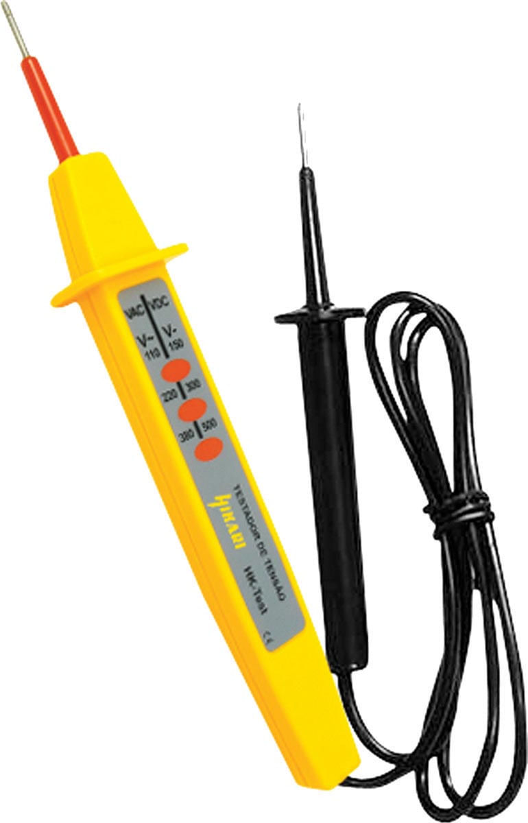 Testador de tensão AC / DC com indicador em três níveis diferentes para tensões de 150V, 300V e 500V DC ou 110V, 220V e 380V AC. Tensão AC: 110/220/380V Tensão DC: 150/300/500V Indicação: Luminosa Dimensões: 185 x 27 x 23mm Peso: 80g