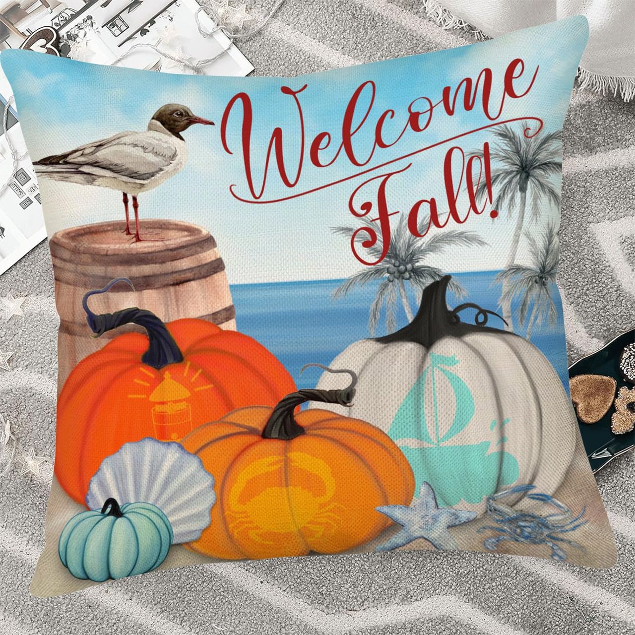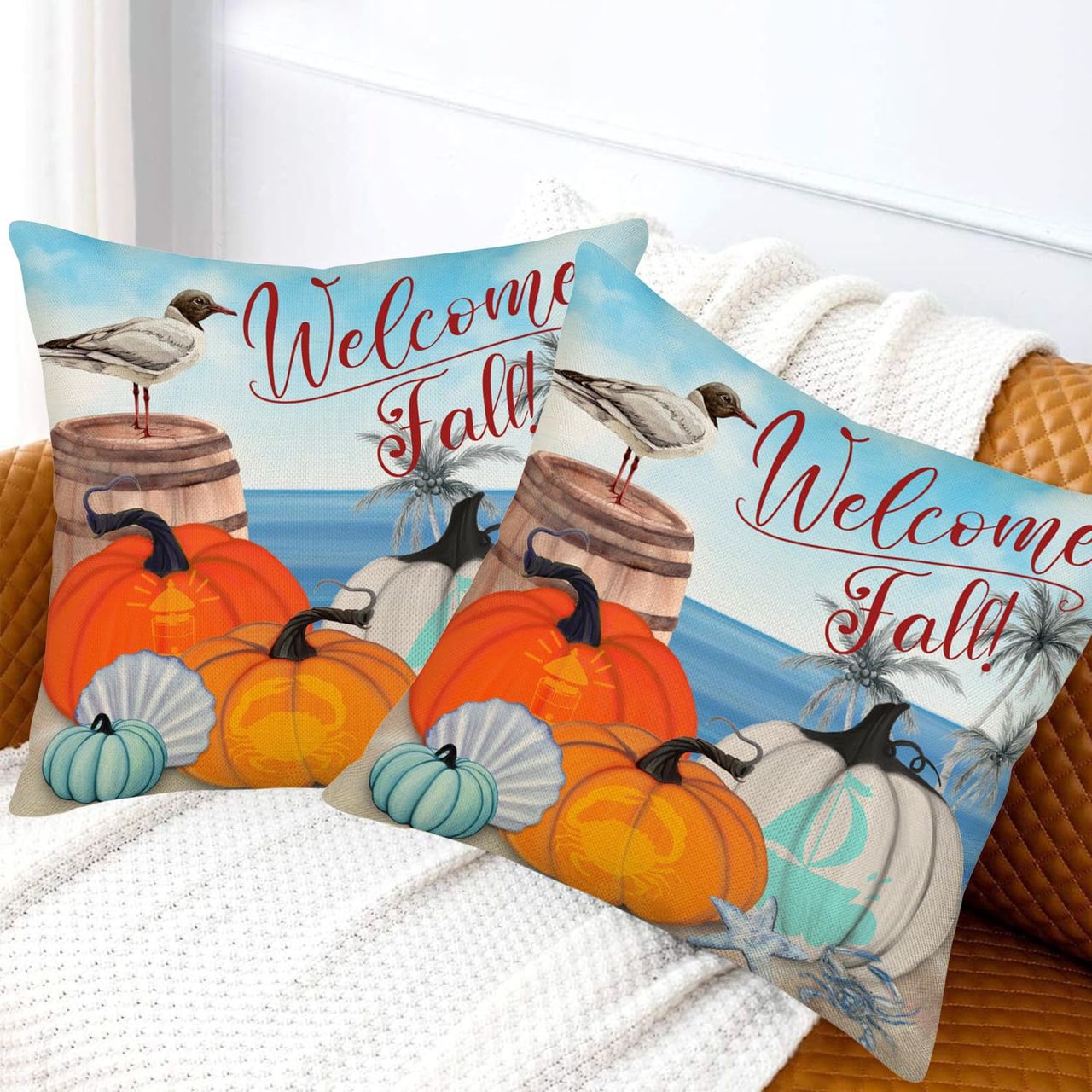 - ▶ Pacote Com 2 Designs De Estampa De Praia De Outono De Abóbora, Cores Vivas, Capas De Travesseiro Com Designs Requintados Que Decoram Sua Vida Familiar.