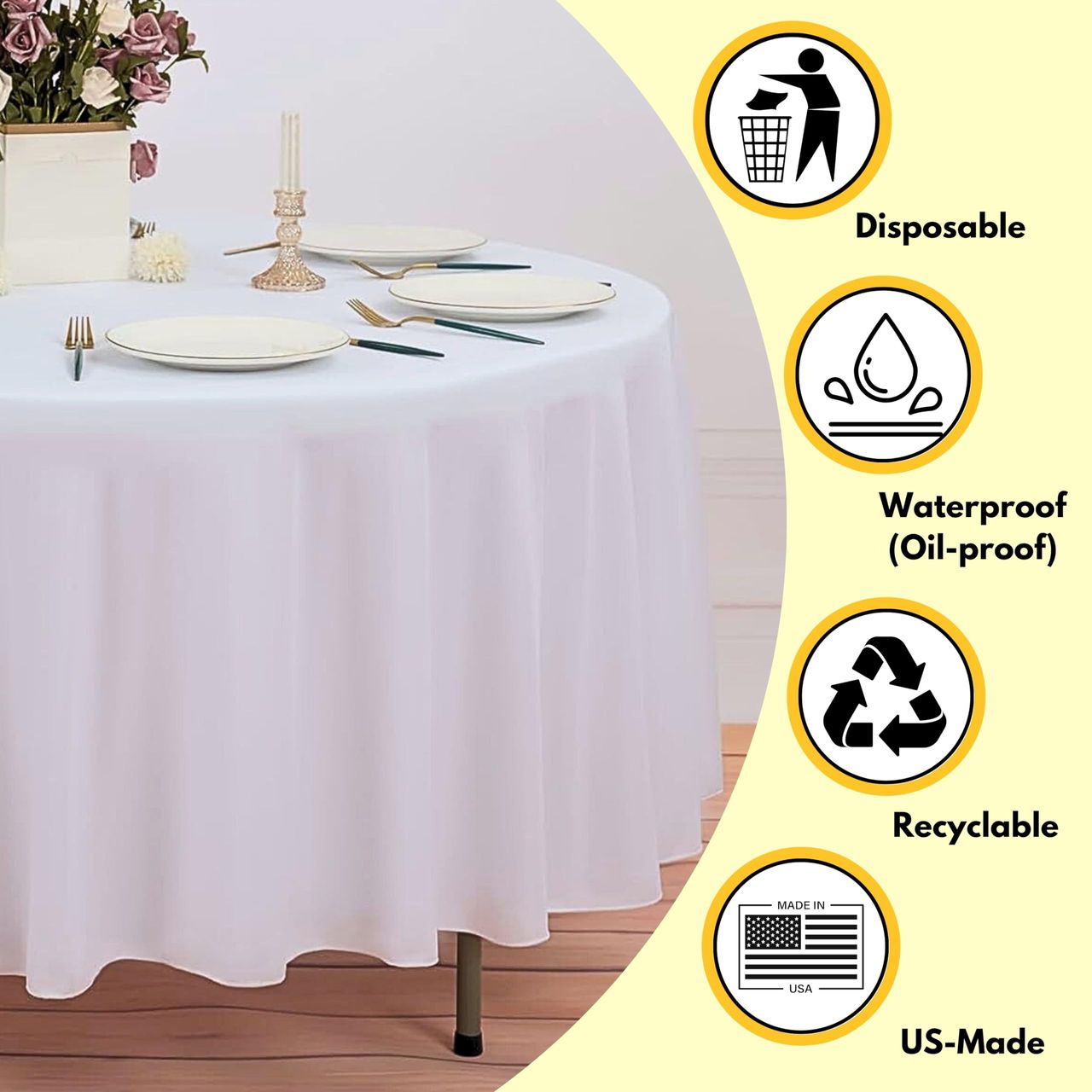 - Toalhas De Mesa Redondas Brancas Ecológicas: A Toalha De Mesa Redonda Descartável É Feita Tendo Em Mente O Seu Conforto, Bem Como A Segurança Do Nosso Meio Ambiente. Estas Toalhas De Mesa Redondas Brancas São Descartáveis E Feitas Inteiramente De Materiais Ecológicos Que São 100% Recicláveis!