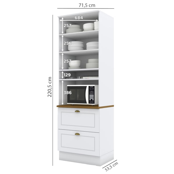 Torre Quente Para Forno 2 Portas E 2 Gavetas 72 Cm, Cozinha Provençal Seu Conceito É Inspirado Nas Clássicas Cozinhas Estilo Americano. Estrutura 100% Mdf De 15mm (fundo Em Mdf De 3mm), Possui Rodapés Com Opção De Instalação Sem Rodapés Suspensa (ferragens Para Fixação Na Parede Inclusas). Suas 2 Portas Equipadas Com Dobradiças Metálicas 35mm Com Amortecimento, E Suas 2 Gavetas Com Corrediças Telescópicas Para Um Deslizar Suave E Silencioso. Conta Com 3 Prateleiras Cada Uma Suportando Até 8kg. Os Fundos Da Parte Onde Serão Instalados Os Eletros, Não Devem Ser Colocados, Para Que Haja Mais Ventilação No Local. Com 1 Nicho Para Por Seus Mantimentos E Acessórios. A Pintura Uv Texturizada Proporciona Um Acabamento Sofisticado E Fácil De Limpar. Com Tampo De 71,5 X 53,3 Cm, E Com Espaços Para 1 Eletrodoméstico. Este Móvel Chegará Na Sua Casa Separado Em 03 Volumes.