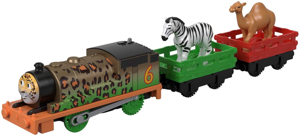 Os Trens De Brinquedo Motorizados Trackmaster Permitem Que As Crianças Experimentem Um Mundo De Brincadeiras Com Momentos Inspirados No Show Da Thomas &, Friends. Percy Gosta Tanto De Animais, Que Comenta Que Deseja Que Todos Os Animais Possam Ficar Em Tidmouth Sheds Com Ele. Este Motor Único Imagina Como Percy Seria Como Um Membro Pleno Do Reino Animal! Com Um Design De Estampa De Leopardo E Dois Vagões De Carga Com Figuras De Zebra E Camelo, Animal Party Percy É Uma Adição Incrível A Qualquer Coleção De Trens De Brinquedo. Use Com Conjuntos De Trens Trackmaster (vendidos Separadamente E Sujeitos À Disponibilidade) Para Criar Aventuras Emocionantes Para Percy E Seus Amigos Animais!