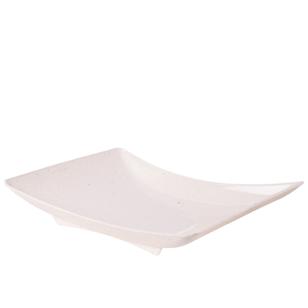 Travessa Rasa Retangular De Plástico Com Pés Para Servir Porções, Petiscos E Antepastos, Com Decoração Predominantemente Branca Com Leves Traços/ranhuras Pretas Por Toda A Peça, Que Traz Uma Aparência Marmorizada Super Requintada À Travessa.