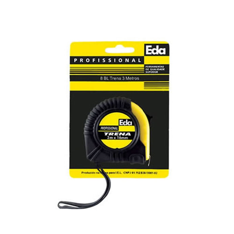 Trena emborrachada 3 mt 8BL Eda.Marca: EDA.Modelo: 8BL.Comprimento da fita: 3 metros.Com trava.Indicação em mm e polegadas.Fita rígida metálica.Peso bruto: 130 gramas