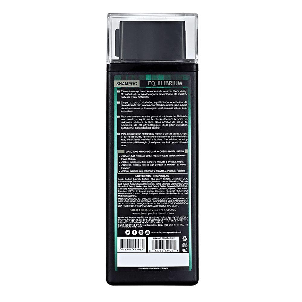 Truss Equilibrium - Shampoo 300ml 300mlo Shampoo Truss Equilibrium Limpa, Hidrata, Atua No Couro Cabeludo Para Regular O Excesso De Oleosidade Da Raiz, Previne O Ressecamento E O Enfraquecimento Prematuro Das Pontas Ao Equilibrar A Umidade Natural Dos Fios. Além Disso, É Perfeito Para Cabelos Mistos A Oleosos.truss Equilibrium - Shampoo Possui Uma Fórmula Poderosa Com Ação De Nano Repair São Micropartículas Que Se Depositam Uniformemente Sobre O Fio De Cabelo, Formam Filme De Proteção, Tem Ação Anti-frizz, Protege A Cor, Garante Brilho Interno E Toque Sedoso. Complexo Vegetal Que Possui Diversos Ingredientes, Como Cinchona, Arnica, Limão, Juá, Maçã, Uva, Que Tonificam, Regulam A Oleosidade, Reduzem A Caspa E As Irritações, Ajudam A Cicatrizar E Estimulam A Circulação Sanguínea. Panthenol Que Tonifica O Couro Cabeludo, Além De Criar Uma Camada Elástica Na Fibra Capilar Que Hidrata E Restaura Os Fios. Soft Hair Agente Condicionante Que Proporciona Força Aos Fios, Desembaraça, Combate O Frizz, Dá Maciez E Brilho. Melhora A Penteabilidade E Minimiza Os Danos À Cutícula. Keratin Formada Por 18 Aminoácidos, Sua Rápida Absorção Pela Fibra Recupera A Resistência Dos Fios Enquanto Deixa O Cabelo Mais Encorpado. Óleo De Argan É Rico Em Ômega 6 (ácido Linoleico) E 9 (ácido Oleico), Revitaliza E Melhora A Flexibilidade Dos Fios. Óleo De Avocado É Rico Em Ácidos Graxos, Aminoácidos E Vitaminas A, B1, B2, C E D, É Um Potente Filtro Solar, Além De Ser Altamente Emoliente. Óleo De Abacaxi É Rico Em Vitaminas E Ácidos Graxos, Hidrata, Diminui O Frizz E Protege Dos Raios Solares.truss Equilibrium - Shampoo Limpa, Controla A Oleosidade, Previne O Ressecamento E Garante Fios Saudáveis, Macios E Com Muita Vida.dica De Aplicação:aplique O Shampoo Sobre O Cabelo Úmido. Massageie Gentilmente E Deixe Agir Por 2 Minutos. Em Seguida, Enxágue. Repita O Procedimento, Caso Necessário.contém:truss Equilibrium - Shampoo 300mltipos De Cabelo - Oleosos Ou Mistospropriedades - Vegano Cruelty Freenome Do Produto - Equilibrium - Shampoo
