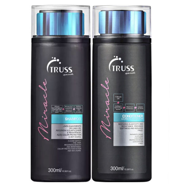 truss Miracle - Condicionador 300ml: Desembaraça, Condiciona Os Fios, Proporciona Maciez E Brilho 3d. Também Recupera A Elasticidade E Resistência, Ajudando No Crescimento Saudável Da Fibra Capilar. Acaba Com O Frizz E Mantém Os Fios Sedosos E Suaves Por Muito Tempo.