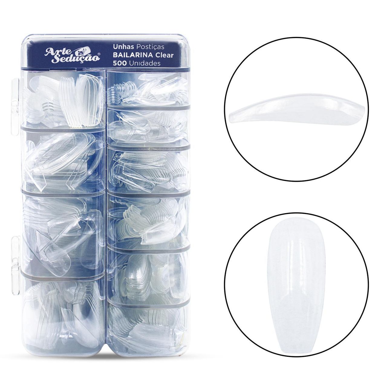 01 - Caixa Acrílica Com 500 Unidades De Unhas Postiças Formato Bailarina Transparente, Arte Sedução