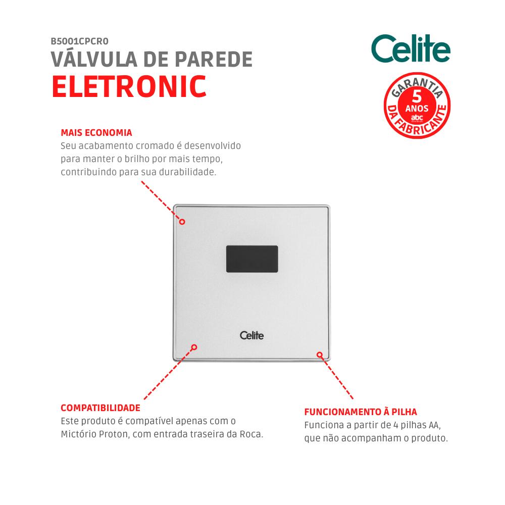 Sobre O Produtoa Válvula De Acionamento Para O Mictório Da Celite Foi Desenvolvida Para Ressaltar O Ambiente Do Mictório, É Ideal Para Ambientes Públicos, Onde A Higiene, Segurança E Sustentabilidade São Fatores Importantes. Além Disso, Com Uma Simples Passada De Mão, É Possível Realizar O Acionamento Da Água. Por Se Tratar De Um Item Produzido Em Abs Cromado E Metal, A Válvula E-eletronic 2.0 Tem Menor Risco De Enferrujar, Tendo Também, Suas Superfícies Lisas, O Que Evita O Acúmulo De Sujeira Ao Redor Do Produto. O Material Da Válvula Faz Com Que Seu Brilho Permaneça Por Mais Tempo, Contribuindo Para Sua Durabilidade. Diferenciais- Compatibilidade: Este Produto É Compatível Apenas Com O Mictório Proton Com Entrada Traseira Da Roca. Procure Pelos Códigos: Referência A3590jf65b - Mictório Rimless Com Entrada Traseira Proton Square Branco Referência A3590jf07b - Mictório Rimless Com Entrada Traseira Proton Square Stone Referência A3590jf08b - Mictório Rimless Com Entrada Traseira Proton Square Matte Black Referência A3590jf62b - Mictório Rimless Com Entrada Traseira Proton Square Blanco Mate Referência A3590jf65b - Mictório Rimless Com Entrada Traseira Proton Square Beige- Funcionamento À Pilha: Para O Funcionamento Do Produto, É Necessário Adquirir 4 Pilhas Aa, Que Não Acompanham O Produto. Informações Técnicas Acabamento: Cromadoligação De Água: 1/2" - 3/4"lugar De Instalação: Mictóriopressão Máxima De Funcionamento (mca): 40pressão Mínima De Funcionamento (mca): 5tipo De Instalação: Paredetipo De Torneira: Válvula Para Mictório Dimensõescomprimento 13 Mm.largura 13 Mm.altura 130 Mm. Garantia5 Anos Fornecidos Pela Fabricante Sobre A Fabricantecom A Perfeita Combinação De Design Democrático, Tecnologias Acessíveis E Qualidade Superior, A Celite Ajuda O Consumidor A Tomar A Melhor Decisão Para Sua Casa E Propõe Soluções Inteligentes Que São Feitas Para Durar. A Celite Traz Soluções Inovadoras Para Facilitar O Dia A Dia Dos Brasileiros