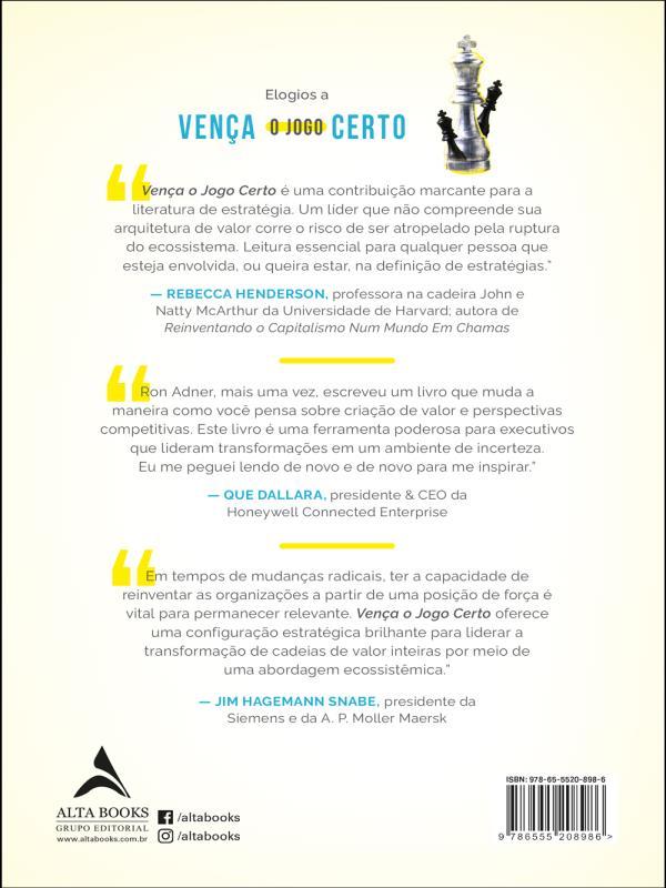 Como Competir Em Um Mundo De Ecossistemas: Estratégias E Ferramentas Para Atacar, Se Defender, Agir Na Hora Certa E Liderar Em Um Cenário Competitivo Em Mutação. A Base Da Competição Está Mudando. Você Está Preparado? A Rivalidade Em Setores Bem Definidos Está Se Mudando Para Ecossistemas Mais Amplos: De Automóveis Para Soluções De Mobilidade, De Atividades Bancárias Para Fintechs, De Transmissões De Televisão Para Streaming. Seus Concorrentes Estão Vindo De Outros Setores De Atividade Econômica, E As Metas Que Procuram Alcançar São Diferentes Daquelas De Seus Rivais Conhecidos. Neste Mundo, Ter Êxito Jogando Dentro Das Velhas Regras Pode Significar Perder O Novo Jogo. Vença O Jogo Certo Apresenta Os Conceitos, As Ferramentas E As Estruturas Necessários Para Enfrentar A Ameaça Da Ruptura Do Ecossistema E Desenvolver Estratégias Que Permitirão À Sua Organização Jogar No Ataque. Neste Mundo, Ser Bem-sucedido Requer Mudar A Maneira Como Você Enxerga A Competição, O Crescimento E A Liderança. Neste Livro, O Especialista Em Estratégia Ron Adner Mostra Um Novo Modo De Pensar, E O Ilustra Com Ideias Avançadas E Casos Convincentes. Como A Estratégia De Defesa Do Ecossistema Livrou A Wayfair E O Spotify De Serem Esmagados Pelas Gigantes Amazon E Apple? Como Oprah Winfrey Reposicionou Os Limites De Seu Setor De Atuação Para Fazer A Transição De Apresentadora De Televisão A Magnata Multimídia? E Como Mudar Para Uma Mentalidade De Alinhamento Viabilizou O Renascimento Da Microsoft Baseado Na Nuvem? Cada Um Desses Movimentos Vinculou-se A Uma Nova Abordagem Junto Aos Concorrentes, Parceiros E Percepção Do Momento Propício Para Implementar Em Suas Organizações. Hoje, Para Os Líderes, A Diferença Entre O Sucesso E O Fracasso Não Está Mais Em Simplesmente Vencer, Mas Em Se Certificar De Vencer O Jogo Certo.