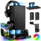 -【suporte Multifuncional Para Xbox Series X】---- O Suporte De Carregamento Do Ventilador Para Xbox Series X Combina As Funções De Ventilador De Console, Carregador De Controlador Duplo, Modo De 15 Luzes Rgb, 2 Baterias Recarregáveis De 1400mah, 8 Unidades Slot Para Cartões De Jogo, 2 Slots Para Cartões De Expansão, Suporte Para Fone De Ouvido, Porta Usb Extra, Etc., O Que Economiza Muito Espaço Para Equipamentos De Jogos, Design Integrado Perfeito Para Fornecer Todos Os Recursos Extras De Que Você Precisa. (inclui: 1* Suporte De Carregador Rgb, 1* Suporte De Fone De Ouvido, 2* Baterias, 1* Manual De Uso)