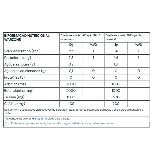 Warzone Pre Workout (300g) warzone Com Pump Matrix™ - O Pré Treino Em 2 Estágios é O Primeiro E Único Pré Treino Do Brasil Com Pump Matrix™. Um Pré Treino Inteligente De Efeito Prolongado Que Funciona Em 2 Estágios. * Estágio 01no Primeiro Estágio Ele Faz Você Atingir O Ápice De Energia Dos Estimulantes Te Colocando Em Um Nível De Alto Rendimento. * Estágio 02quando Isso Acontece, De Forma Inteligente O Estágio 02 É Ativado Com A Pump Matrix™ Liberando Mais Potência Muscular Ao Intensificar O Fluxo Sanguíneo. ele Ultrapassa Os Limites Dos Estimulantes, Te Colocando Em Um Nível Prolongado De Ultra Performance. benefícios: - 2.000mg De Beta Alanina, Por Porção,- 2.000mg Arginina,- 1.000mg Taurina,- 400mg Cafeína,- Hiper Foco Durante O Treino,- Aumento Do Fluxo Sanguíneo Para O Músculo Alvo Garantindo Maior Poder Anabólico E Recuperação Muscular,- Aumento Da Resistência À Dor Deixando O Treino Mais Intenso.