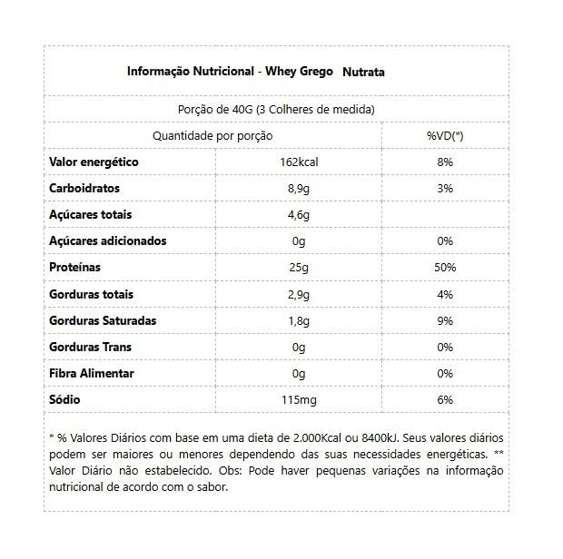 Whey Grego Refil (900g) a Combinação Desses Dois Tipos De Filtração E A Adição Do Famoso Yogurte Grego, Conferem Ao Whey Grego Da Nutrata Uma Cremosidade E Sabor Incomparável, Além De Um Excelente Aporte Proteico E Baixa Quantidade De Carboidratos E Gorduras.whey Protein Hidrolisada: O Processo De Hidrólise Consiste Em Quebrar Proteínas Em Tamanhos Menores, Para Facilitar Sua Absorção E Digestão. Contém Entre 90% A 98% De Proteínas De Alta Qualidade, E Menor Possibilidade De Reações Alérgicas Do Que A Versão Não Hidrolisada. Tornando-se Uma Ótima Opção Para Dietas Restritas E Construção Muscular. whey Protein Concentrado: é Obtido Através De Um Processo De Separação Física (filtração), Onde O Produto Acabado Contém Cerca De 80% De Proteína Mantendo Sua Estrutura Intacta. Em Virtude Do Seu Elevado Valor Nutritivo E Por Não Sofrerem Alterações De Ácidos No Ambiente Estomacal, No Intestino Delgado, São Rapidamente Digeridas E Altamente Absorvidos. - Agora O Whey Grego – Nutrata – Conta Com Whey Protein Isolado, Onde É Conservada A Pureza Da Proteína Do Leite. Sua Grande Diferença É Justamente A Concentração De Proteínas. O Suplemento Consegue Oferecer Teores De Proteína Entre 92% E 98%, Com Baixíssimas Concentrações De Lactose, Gordura E Pouco Carboidrato. benefícios:* Contribui Para O Aumento Da Saciedade,* Favorece A Síntese Proteica,* Estimula A Recuperação E Construção Muscular,* Aporte Regulador Da Função Imunológica,* Auxílio No Pós-operatório Bariátrico E Em Dietas De Emagrecimento,* Aumento De Massa Muscular Magra.