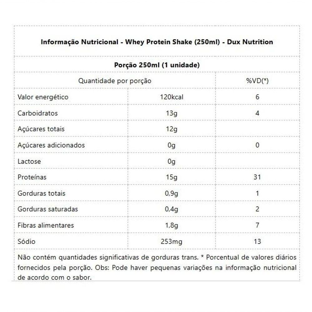 Whey Protein Shake (250ml) - Sabor: Doce De Leitewhey Protein Shake (250ml) O Whey Da Dux Agora Pronto Para Beber. O Whey Protein Shake Dux É Uma Bebida Proteica Desenvolvida Com As Melhores Tecnologias E Ingredientes Para Entregar Praticidade, Qualidade E Segurança Para Sua Rotina. Não É Necessário Adicionar Água, Basta Abrir E Se Deliciar Com O Sabor Surpreendente Do Shake. A Fórmula Do Whey Protein Shake Foi Desenvolvida Com Uma Proteína Do Leite 100% Concentrada E Sem Lactose, Com Alto Controle E Garantia De Qualidade. Fabricado Com Tecnologia De Ponta, Ultra Pasteurizado E Envasado Em Embalagem Asséptica Exclusiva, Com 6 Folhas De Revestimento, Garantindo Maior Segurança Para O Consumo Por Até 9 Meses Sem Necessidade De Refrigeração Ou Conservantes. Benefícios: - 15g De Proteína,- 3g De Bcaas,- Zero Gorduras,- Zero Lactose,- Zero Amido,- Zero Caseinato,- Sem Adição De Açúcares,- Ótima Opção Para Lanches Entre As Refeições.